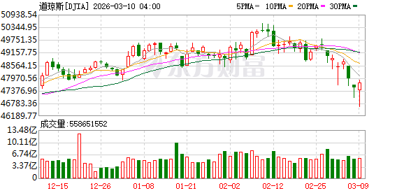 美股市场:美股三大指数03月09日收盘全线上涨。截至收盘,道琼斯工业平均指数比前一交易日上涨239.25点,收于47740.8点,涨幅为0.5%;标准普尔500种股票指数上涨55.97点,收于6795.99点,涨幅为0.83%;纳斯达克综合指数上涨308.27点,收于22695.95点,涨幅为1.38%。据央视新闻,美国总统特朗普表示,美国对伊朗的战争可能很快就会结束。