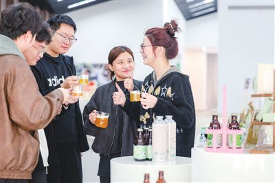 昨天,在长兴县水口乡顾渚村文创展台,游客现场体验紫笋啤酒。这款特色精酿由当地青年农创客丁洁团队打造,以本地紫笋茶末为原料,经低温萃取、30天发酵,将传统贡茶与现代精酿工艺融合,实现茶末变废为宝,有效延伸茶产业链。该款产品迅速走红文旅市场,成为游客喜爱的伴手礼。
