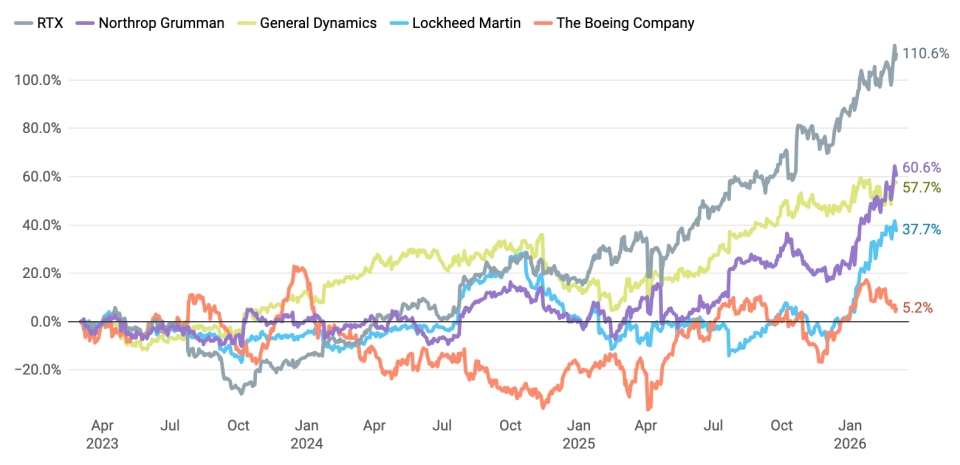 上图展示了2023年3月至2026年3月期间美国最大国防承包商的股价涨幅。RTX以110%的涨幅居首,诺斯罗普·格鲁曼以60%紧随其后,通用动力上涨57%,洛克希德·马丁增长37%,波音公司涨幅为5%。