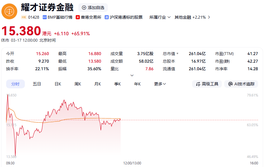 耀才证券金融今日开盘暴涨,一度涨超80%,截至中午收盘,该股仍涨65.91%。