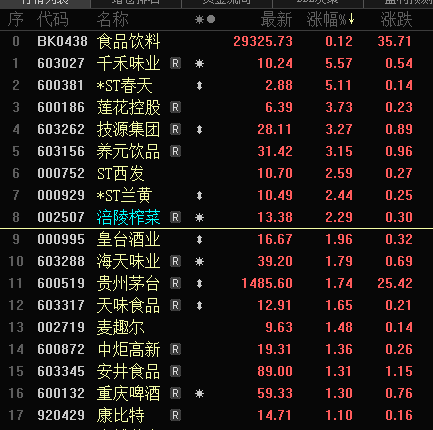 食品饮料行业中的千禾味业、莲花控股、养元饮品等股票涨幅居前。