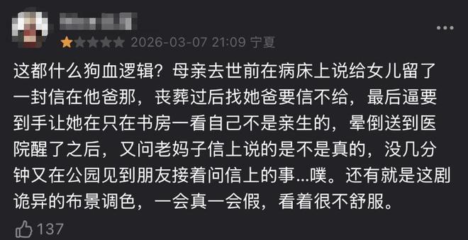 得知身世真相时,她掩面而泣、身形摇晃,却缺失从云端跌入泥沼那一刻的眩晕、错愕与存在性震荡。